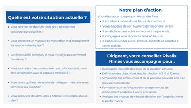 C’est dans cette optique que l'expert en pilotage d’entreprise Rivalis Nîmes vous accompagne au quotidien dans la gestion de vos équipes et dans le développement de vos pratiques managériales. Qu’il s’agisse de recruter des collaborateurs qualifiés, de motiver vos équipes, d’apprendre à déléguer ou de structurer votre management, nos conseillers vous apportent des réponses concrètes et adaptées à vos enjeux.