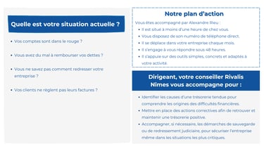 Vous souhaitez améliorer vos compétences en gestion financière ou savoir comment résoudre un problème de trésorerie ? Notre conseiller en pilotage d’entreprise répond à toutes vos questions et vous accompagne pour identifier précisément la nature et les causes de vos difficultés.